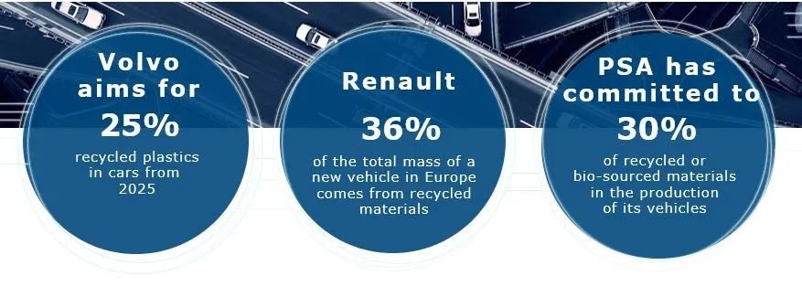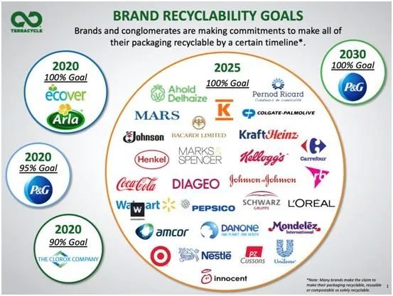 不僅僅我們熟知的快速消費品巨頭,如雀巢,可口可樂,聯(lián)合利華,寶潔等等都明確提出包裝材料使用100%可回收再利用的時間目標;無獨有偶,汽車行業(yè)的OEM諸如沃爾沃,雷諾,PSA也都有自己的車用塑料可回收或生物基材料利用率目標。可見,回收材料的利用和推廣已經(jīng)成為整個材料產(chǎn)業(yè)的主流趨勢。