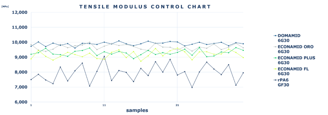 (注:rPA6GF30 為市場常規(guī)的消費回收規(guī)格測試數(shù)據(jù))